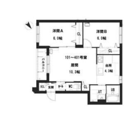 2LDK(60.12m²)└ LD10.3帖 K4.3帖 洋室6帖 洋室6帖