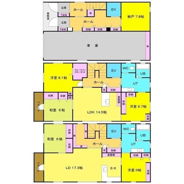 二世帯型(291.72m²)└ LDK14.5帖 LD17.0帖 K6.0帖 洋室8.1帖 洋室6.7帖 洋室6.0帖 和室6.0帖 和室6.0帖 S(納屋)7.8帖