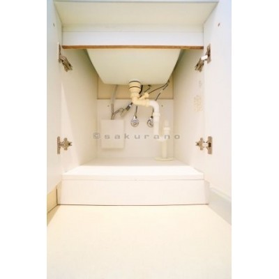 シンクの下だけでなく、化粧台の鏡の裏にも収納があります。