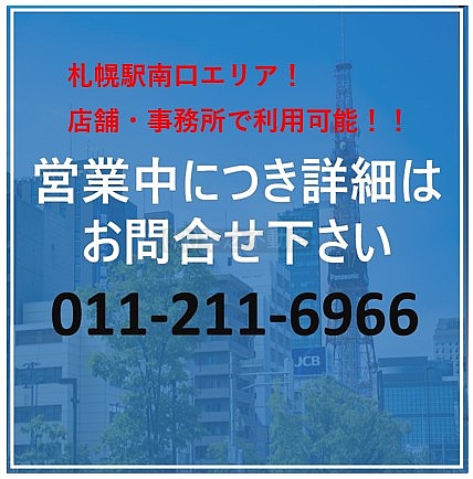 ここに注目!札幌駅南口エリアに退去予定物件が出ました!地下鉄駅出口から徒歩1分ほどの物件です。店舗・事務所で使用可能です。※事前に業種確認が必要です。契約期間・契約形態はご相談となります。お手数をお掛けしますがお問合せ下さいませ。 【土日祝も営業しております!】
