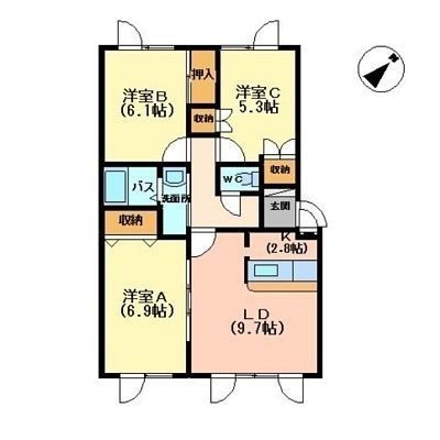 3LDK(69.42m²)└ LD9.7帖 K2.8帖 洋室6.9帖 洋室6.1帖 洋室5.3帖
