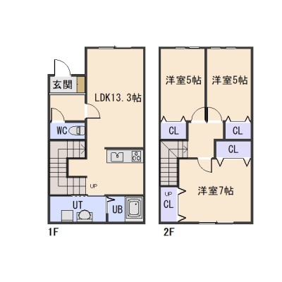 3LDK(75.04m²)└ 1階:LDK13.37帖 / 2階:洋室7帖 洋室5帖 洋室5帖