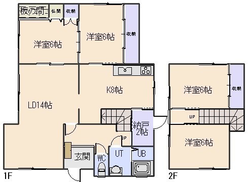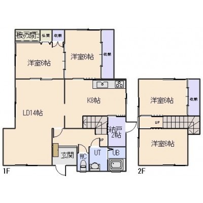 4LDK(103.68m²)└ 1階:LD14帖 K8帖 洋室6帖 洋室6帖 その他2帖 / 2階:洋室8帖