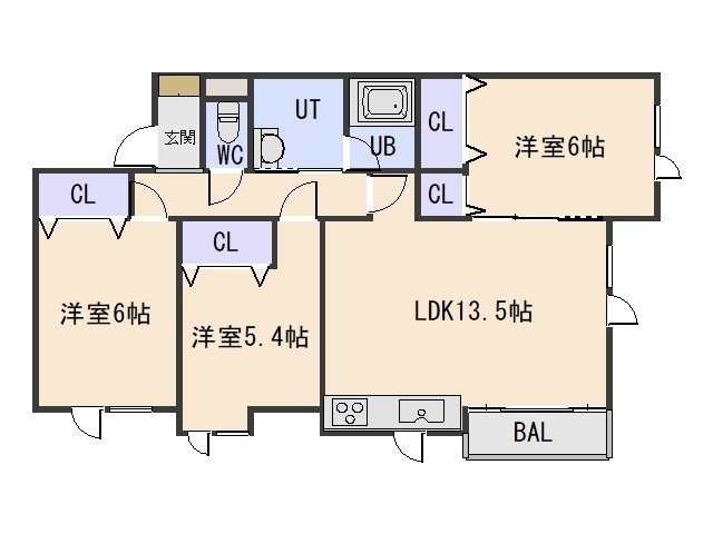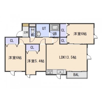3LDK(71.55m²)└ LDK13.5帖 洋室6帖 洋室6帖 洋室5.4帖