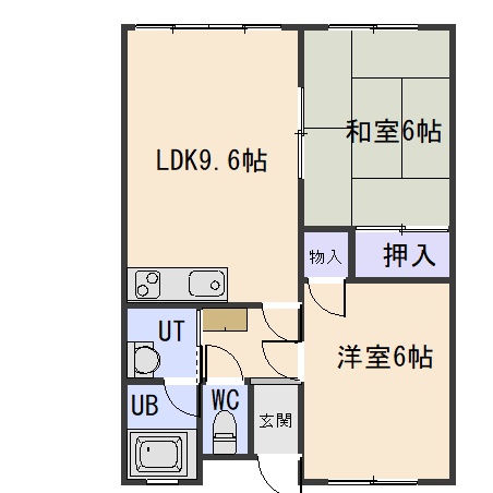 2DK(45.53m²)└ DK9.6帖 洋室6帖 和室6帖