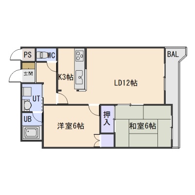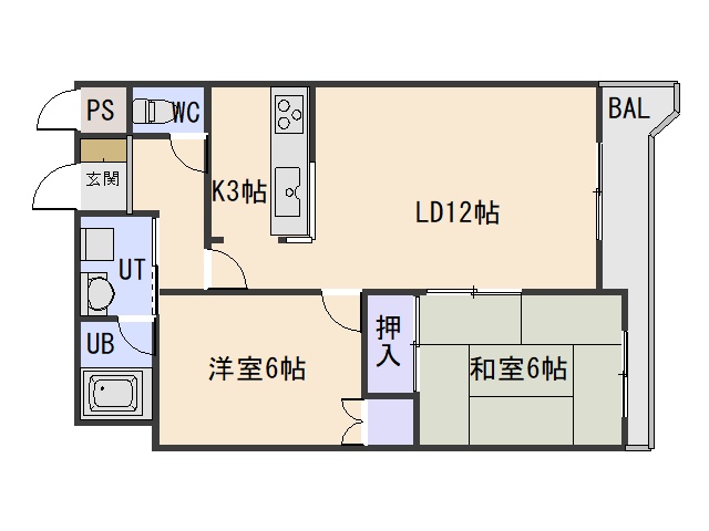 2LDK(58m²)└ LD12帖 K3帖 和室6帖 洋室6帖