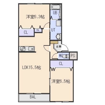 2LDK(61.71m²)└ LDK15.5帖 洋室6.5帖 洋室6.3帖
