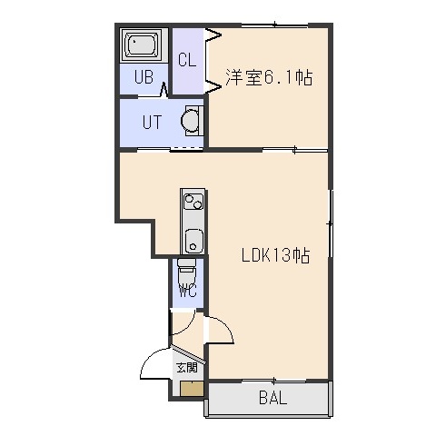 1LDK(42.85m²)└ LDK13帖 洋室6.1帖