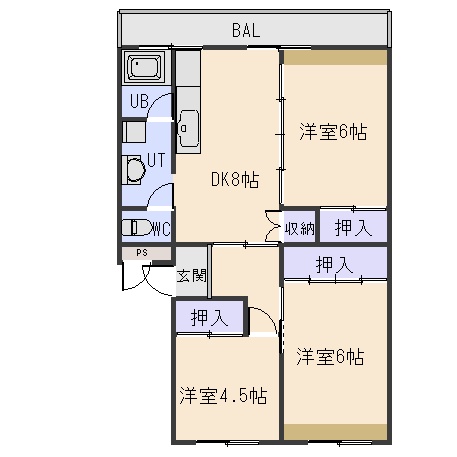 3DK(61.12m²)└ DK8帖 洋室6帖 洋室6帖 洋室4.5帖