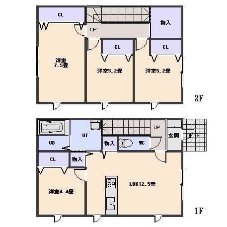 4LDK(90.08m²)└ 1階:LDK12.5帖 洋室4.4帖 / 2階:洋室7.5帖 洋室5.2帖 洋室5.2帖