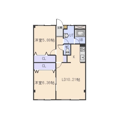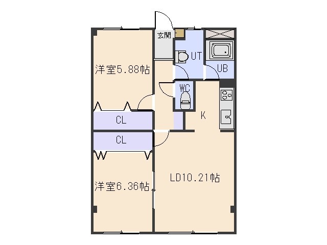 2LDK(58.5m²)└ LD10.21帖 K 洋室6.36帖 洋室5.88帖