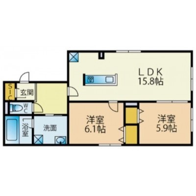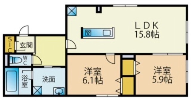 2LDK(63.08m²)└ LDK15.8帖 洋室6.1帖 洋室5.9帖