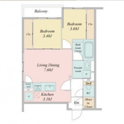 2LDK(44.26m²)└ LD7.6帖 K3.1帖 洋室3.69帖 洋室3.4帖