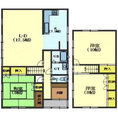 3LDK(111.78m²)└ 1階:LDK17.5帖 和室8帖 K7.5帖 / 2階:洋室10帖 洋室8帖