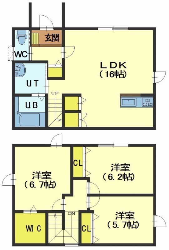 3LDK(84.46m²)└ 1階:LDK16帖 / 2階:洋室6.7帖 洋室6.2帖 洋室5.7帖
