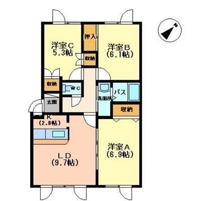 3LDK(69.42m²)└ 1階:LD9.7帖 / その他:K2.8帖 洋室6.1帖 洋室6.9帖 洋室5.3帖