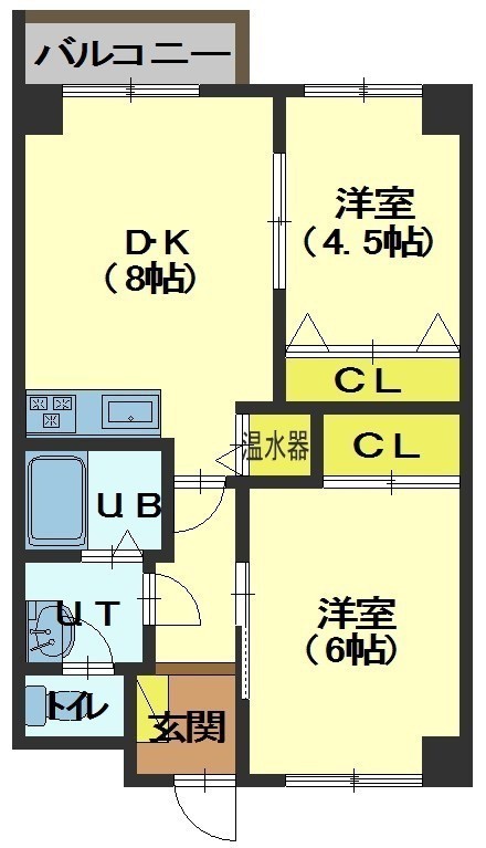 2DK(44.55m²)└ DK8帖 洋室6帖 洋室4.5帖