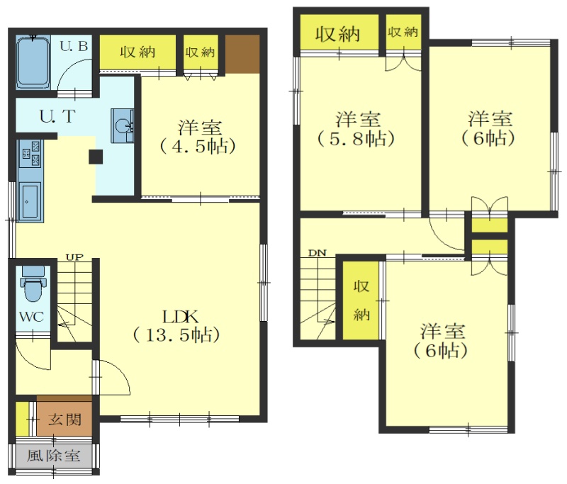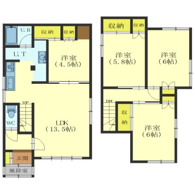 4LDK(82.89m²)└ 1階:LDK13.5帖 洋室4.5帖 / 2階:洋室6帖 洋室6帖 洋室5.8帖