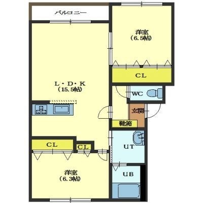 2LDK(61.71m²)└ LDK15.5帖 洋室6.5帖 洋室6.3帖