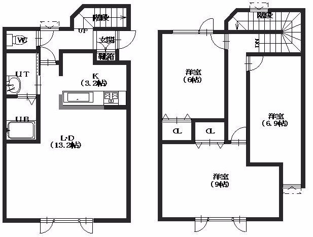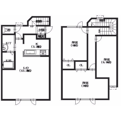 3LDK(87.02m²)└ 2階:K3.2帖 / 3階:洋室9帖 洋室6.9帖 洋室6帖 / 12階:LD13.2帖