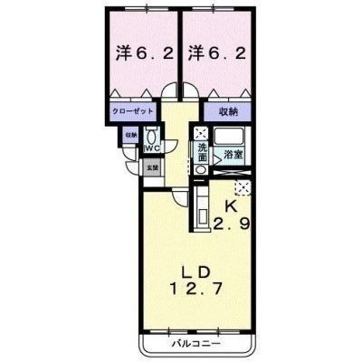 2LDK(63m²)└ 1階:LD12.7帖 洋室6.2帖 洋室6.2帖 K2.9帖