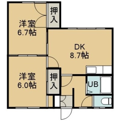 2LDK(42.36m²)└ 2階:DK8.7帖 洋室6.7帖 洋室6帖