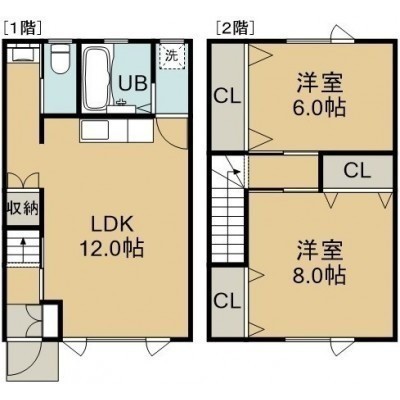 2LDK(62.92m²)└ 1階:LDK12帖 / 2階:洋室8帖 洋室6帖
