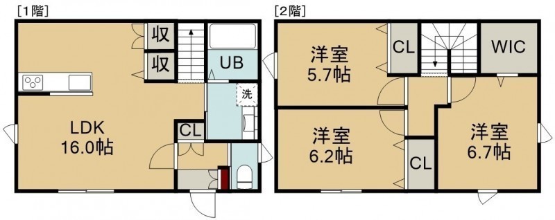 3LDK(84.46m²)└ 1階:LDK16帖 / 2階:洋室6.7帖 洋室6.2帖 洋室5.7帖