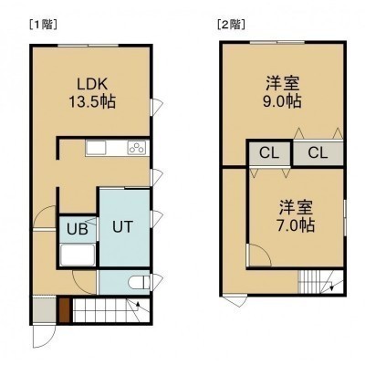 2LDK(76.07m²)└ 1階:LDK13.5帖 / 2階:洋室9帖 洋室7帖