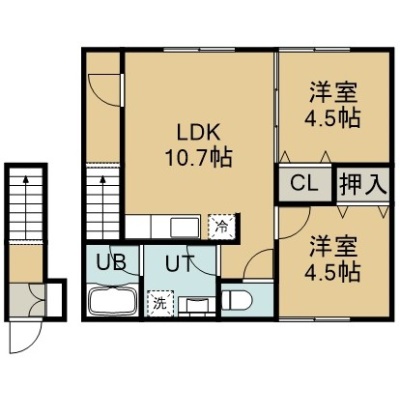 2LDK(42.06m²)└ 2階:LDK10.7帖 洋室4.5帖 洋室4.5帖