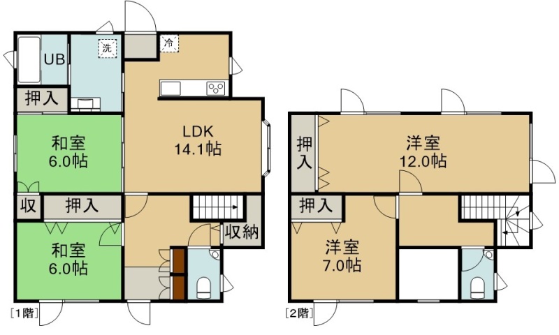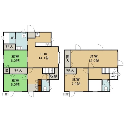 4LDK(115.78m²)└ 1階:LDK14.1帖 和室6帖 和室6帖 / 2階:洋室12帖 洋室7帖