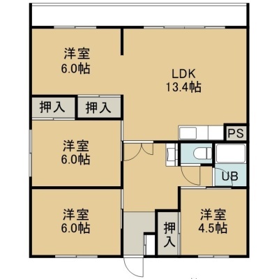4LDK(77m²)└ 1階:LDK13.4帖 洋室6帖 洋室6帖 洋室6帖 洋室4.5帖