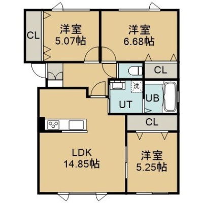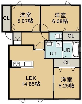 3LDK(73.42m²)└ 2階:LDK14.85帖 洋室6.68帖 洋室5.25帖 洋室5.07帖