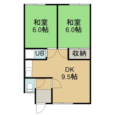 2DK(43.8m²)└ 1階:DK9.5帖 和室6帖 和室6帖