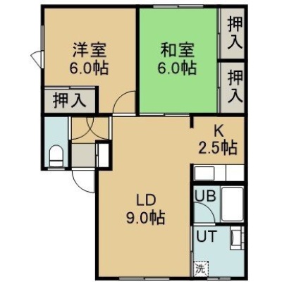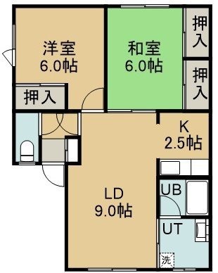 2LDK(46.98m²)└ 2階:LD9帖 K2.5帖 洋室6帖 和室6帖