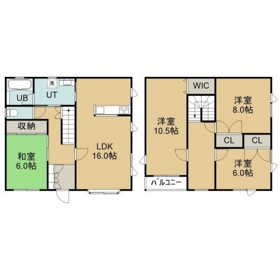 4LDK(105.16m²)└ 1階:LDK16帖 和室6帖 / 2階:洋室10.5帖 洋室8帖 洋室6帖