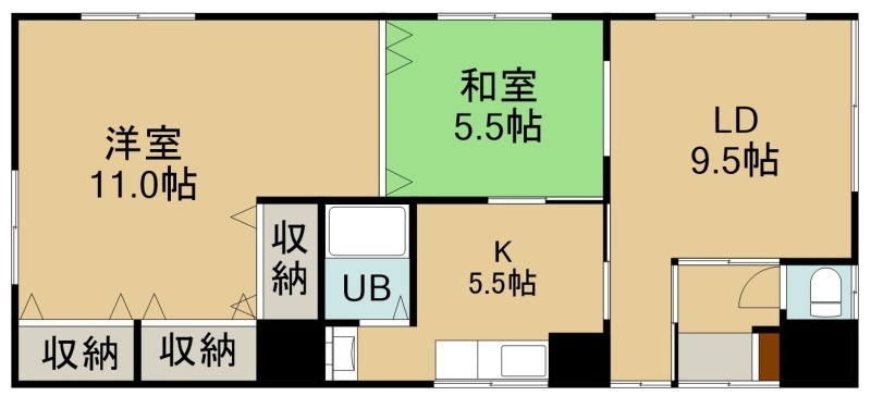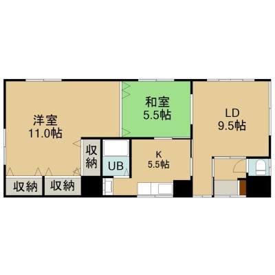2LDK(66.58m²)└ 1階:LD9.5帖 K5.5帖 洋室11帖 和室5.5帖