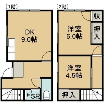 2DK(52m²)└ 1階:DK9帖 / 2階:洋室6帖 洋室4.5帖