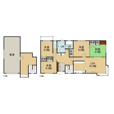 4LDK(102.87m²)└ 2階:LDK16帖 洋室8帖 洋室6帖 洋室6帖 和室6帖