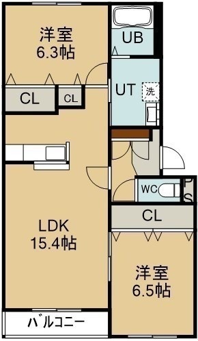 2LDK(61.71m²)└ 4階:LDK15.4帖 洋室6.5帖 洋室6.3帖