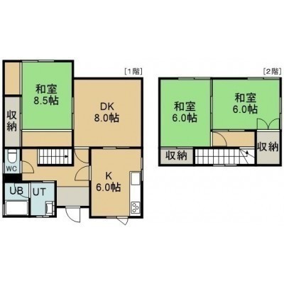 3LDK(85.96m²)└ 1階:LD8帖 K6帖 和室8.5帖 / 2階:和室6帖 和室6帖