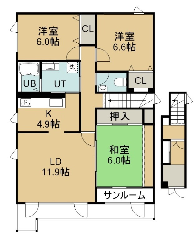 3LDK(97.54m²)└ 2階:LD11.9帖 K4.9帖 洋室6.6帖 洋室6.1帖 和室6帖