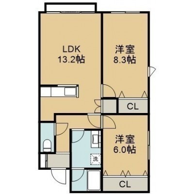 2LDK(62.37m²)└ 2階:LDK13.2帖 洋室8.3帖 洋室6帖