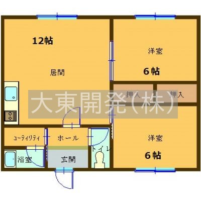 2DK(53.46m²)└ LDK12帖 洋室6帖 洋室6帖 / 居間10x洋間6x洋間6