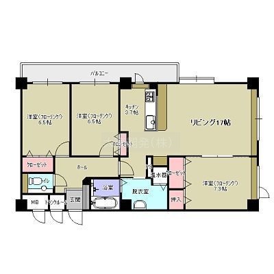 3LDK(91.69m²)└ L17.3帖 洋室7.3帖 洋室6.5帖 洋室6.5帖 K3.7帖 / 17.3x7.3x6.5x6.5x3.7K×脱衣室・バルコニー