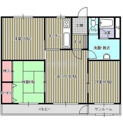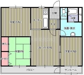 3LDK(73.8m²)└ L10帖 洋室6帖 和室6帖 K / リビング10×洋室6×6×和室6×キッチン×バルコニー×脱衣室×サンルーム