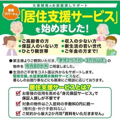 ここに注目!★【居住支援物件】【権利金・仲介手数料・1か月分賃料が不要】★★ガステーブル、照明器具、灯油ストーブも当社管理物件は標準装備しております♪★新生活のスタートを徹底応援します。ご案内ご希望のご連絡はお気軽にお問合せください。★創業50年の感謝を込めて、大東開発㈱が提案する「居住支援サービス」をぜひご利用ください。