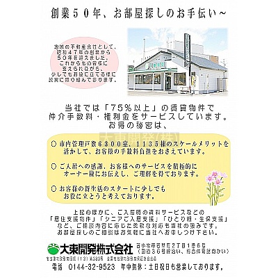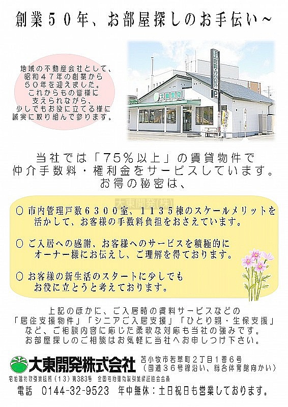 お部屋探しは大東開発㈱ 0144-32-9523 までお問い合わせ下さいませ