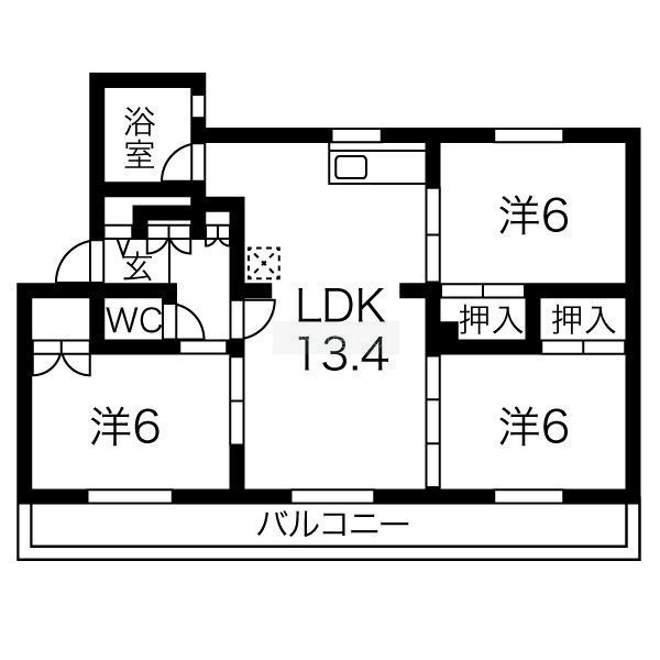 3LDK(65.98m²)└ LDK13.4帖 洋室6帖 洋室6帖 洋室6帖