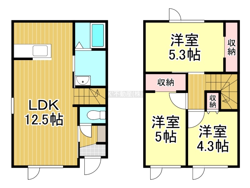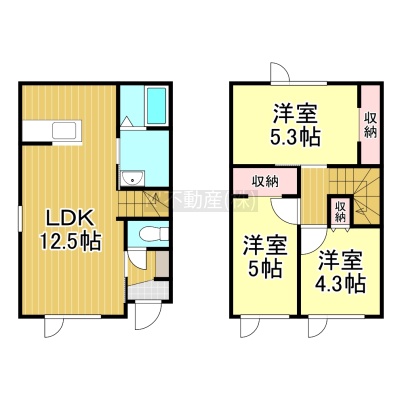 3LDK(67.39m²)└ 1階:LDK12.5帖 / 2階:洋室5.3帖 洋室5帖 洋室4.3帖